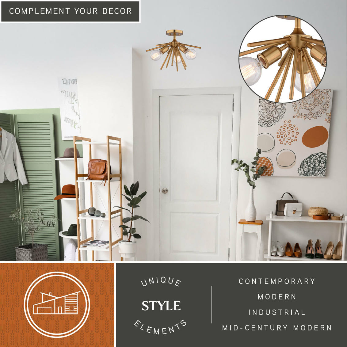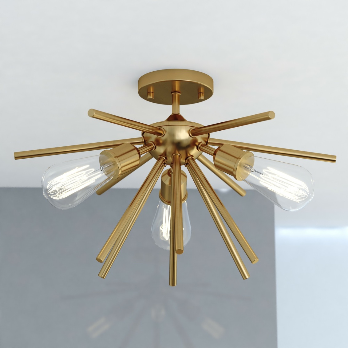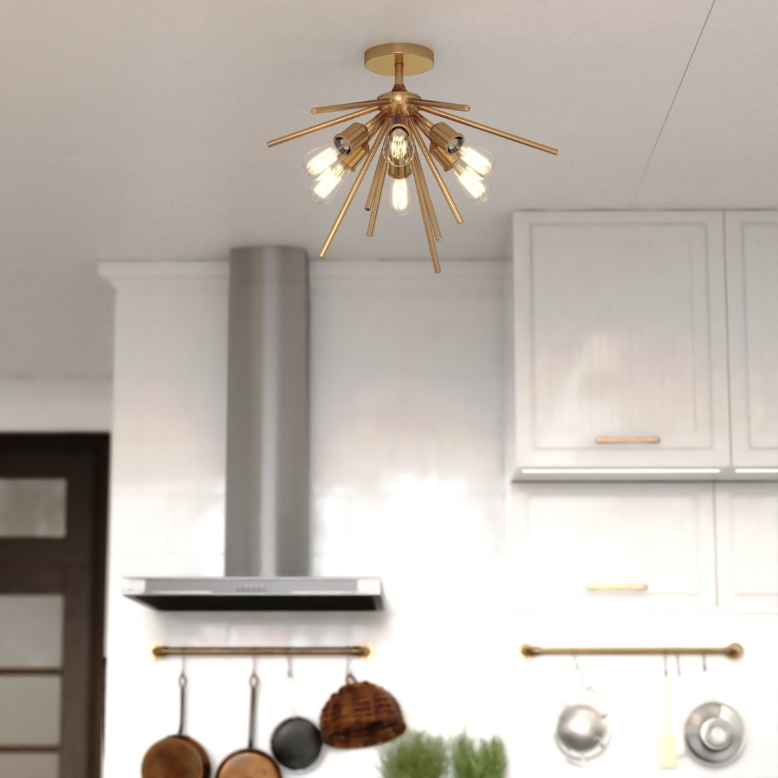 Mid-century meets modern in this timeless and uniquely artistic sputnik semi-flush ceiling light from the Estelle collection. Its perfectly balanced open design creates striking visual interest while providing bright, evenly distributed ambient light. Designed to add elegance and drama to dining rooms, living rooms, foyers, kitchens, hallways, or bedrooms, this fixture feels both bold and versatile. Available in multiple configurations, sizes, and finishes, it complements a wide range of on-trend interior spaces.