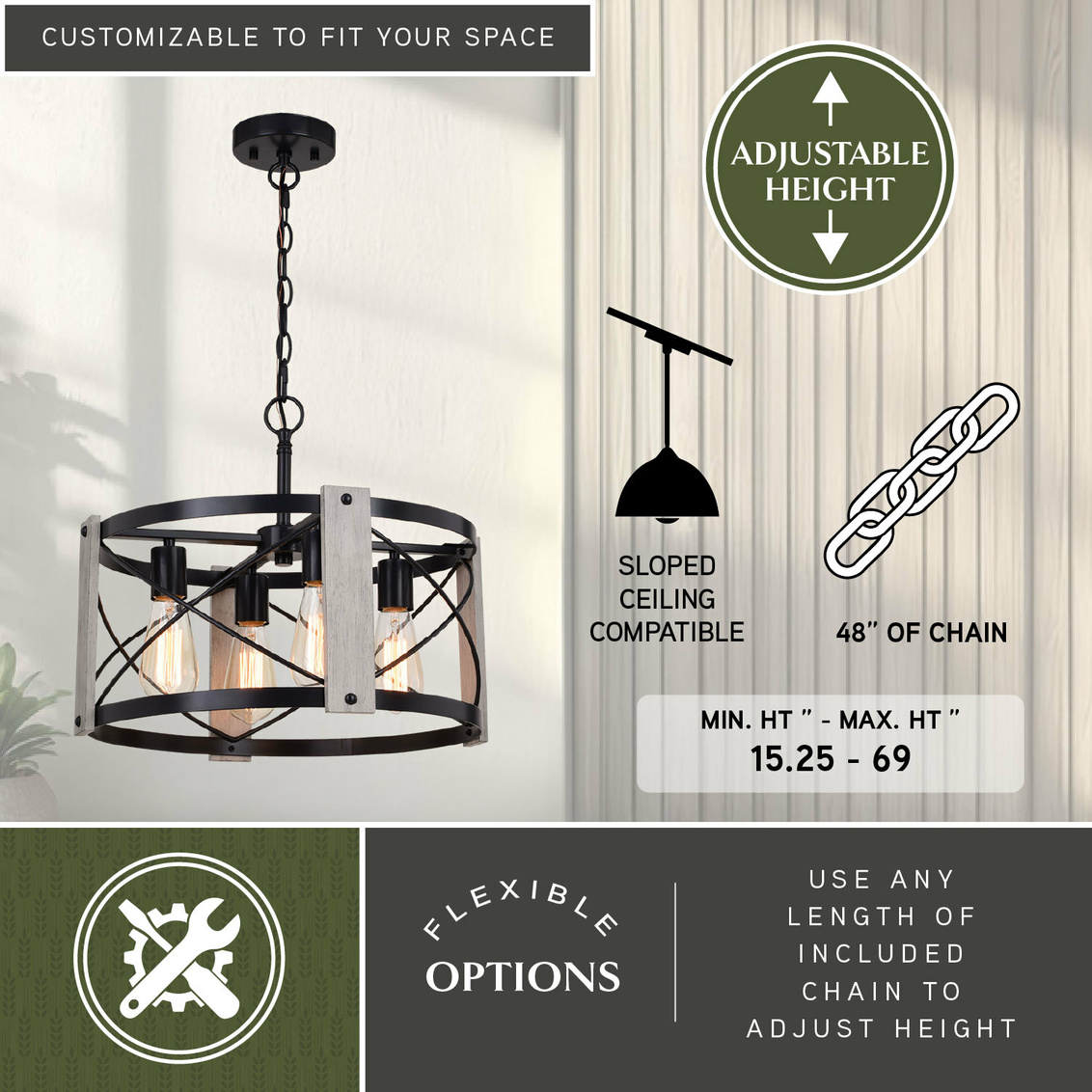 Keyword:Edison Filament Pendant Light Beige Adjustable Angled Ceiling Sloped Vaulted Chain Bar Area Bedroom Dining Room Entrance Entryway Family Indoor Interior Kitchen Island Steel Fixture Hanging Lighting Mount Table Cage Drum Farmhouse Modern