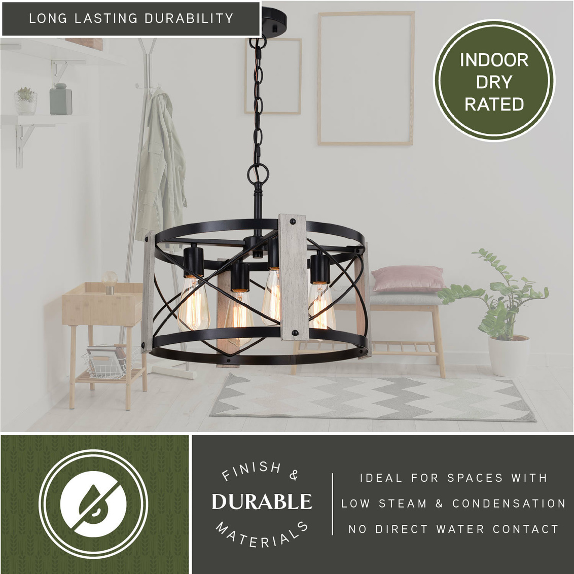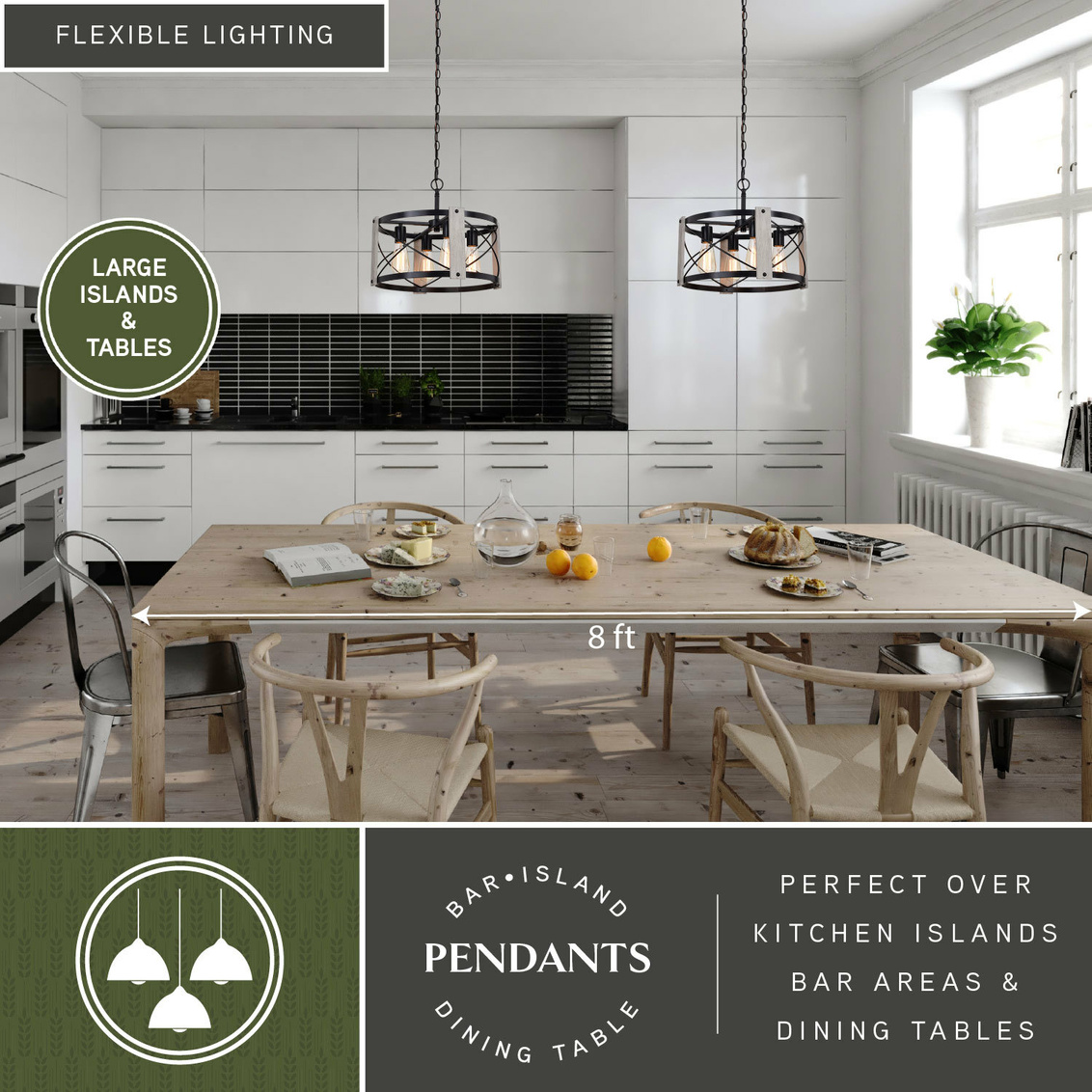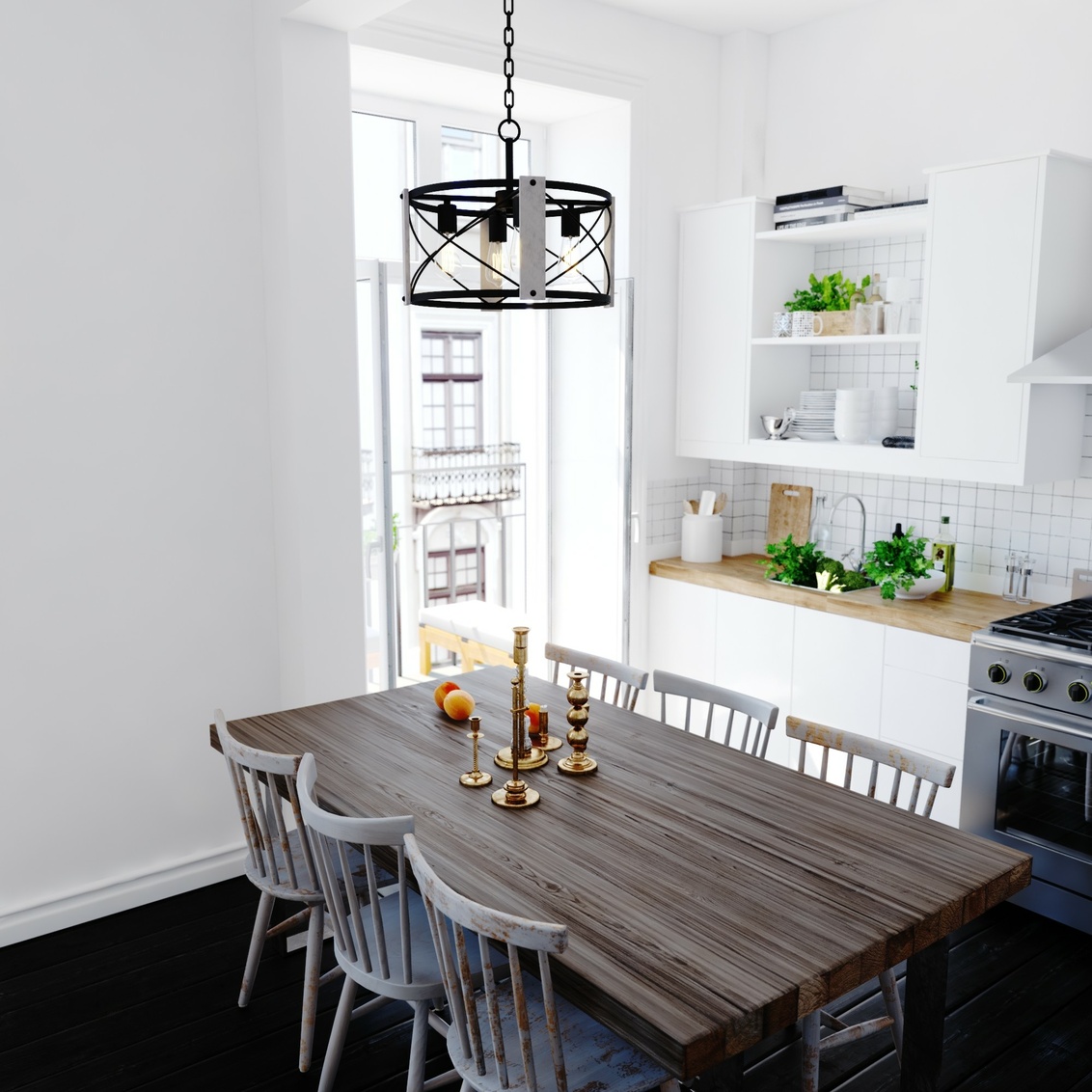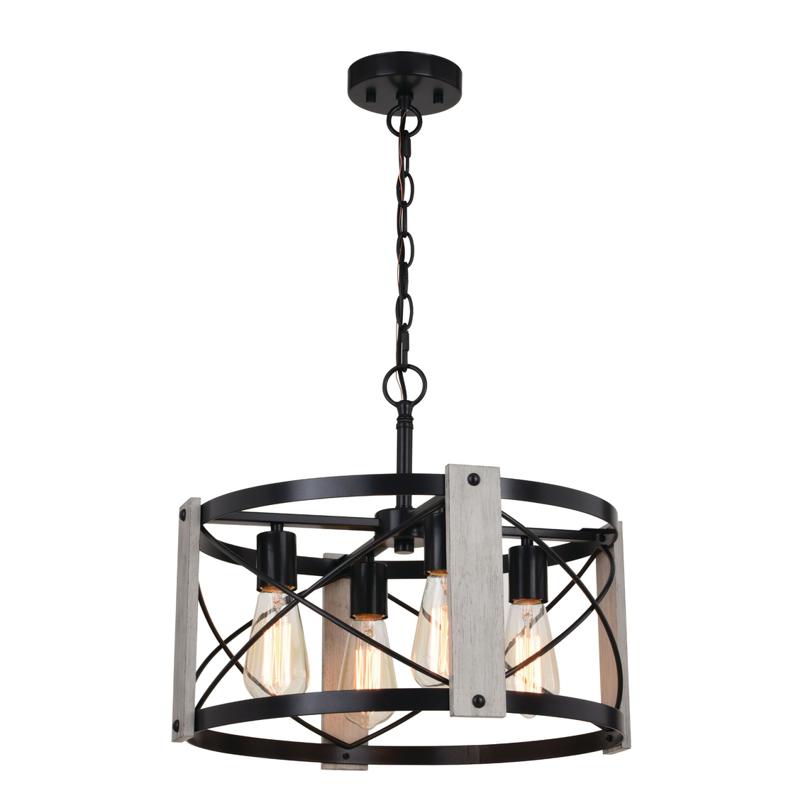 Farmhouse style is fully realized in the Burien pendant with a bold yet welcoming presence. Strong vertical supports encircle the fixture, accented by crisp black crisscross detailing that adds structure and visual interest. The open drum design allows light to fill the room, creating a warm and inviting atmosphere. Ideal for dining areas or living spaces, this pendant brings balanced character and timeless appeal to the interior.